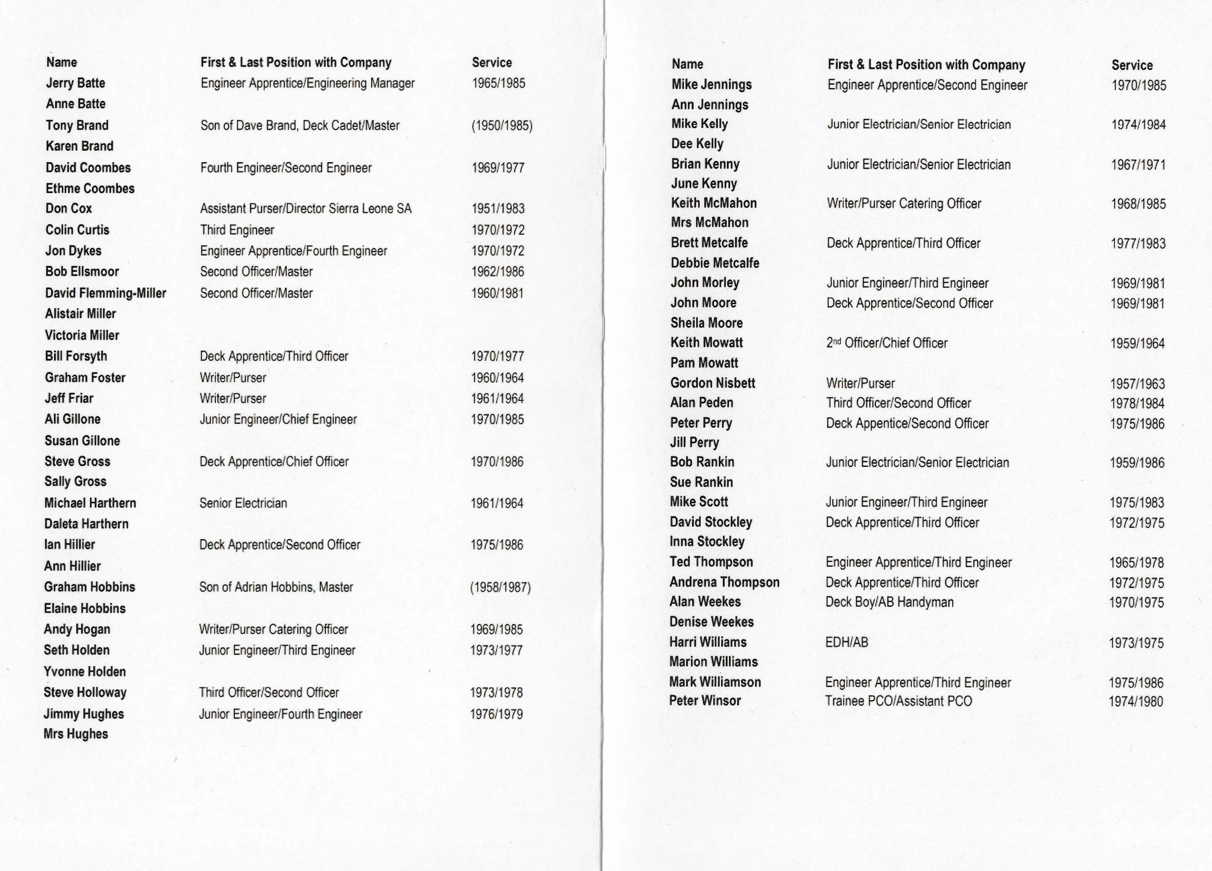 Alistair Miller, Victoria Miller, Mark Williamson, Elaine Hobbins, Graham Hobbins (back), Jill Perry (middle) Brian Kenny (front), Ann Jennings (middle), June Kenny (front) John Moore (bac (back)k), John Morley (middle), David Fleming-Miller (front), Mike Scott (back), Don Cox (back), Pam Mowatt (back), Colin Curtis (front), Keith Mowatt (back), Alan Pedan (back), Mike Jennings (front) Peter Perry (back), Bob Ellsmoore (middle), Jimmy Hughs (back), Alistair Gillone (front), Bill Forsyth (front), Harri Williams (middle), Alan Weekes (back), Denise Weekes (middle), Tony Brand (back), Karen Brand (front), David Coombes (back) Ethme Coombes (front), Jeff Friar (hidden back), Gordon Nisbet (middle), Debbie Metcalfe (front), Brett Metcalfe (middle), Jerry Batte, Anne Batte, Andrena Thompson, Mike Kelly (front), Ted Thompson (back), Sue Rankin (front), Bob Rankin (back)