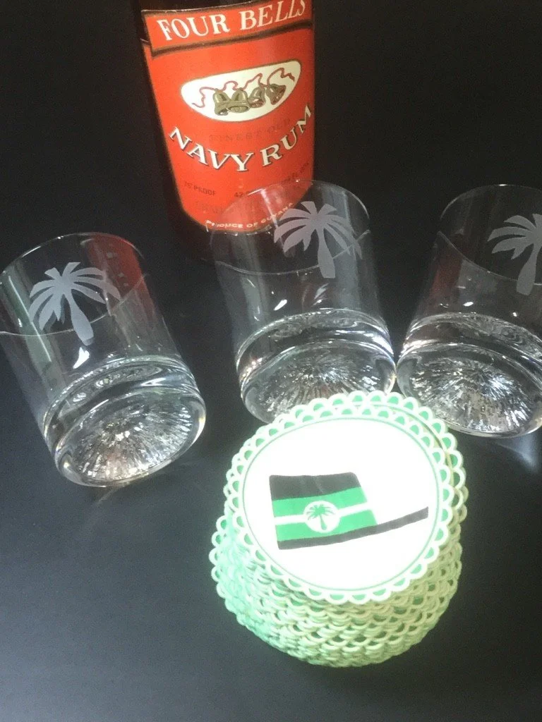 Palm Line rum glasses with coasters and the famous, or perhaps infamous, Four Bells Rum. (JRB)