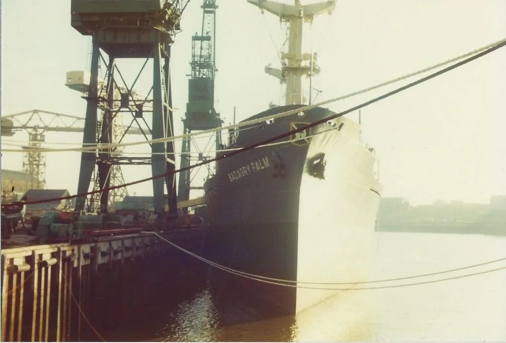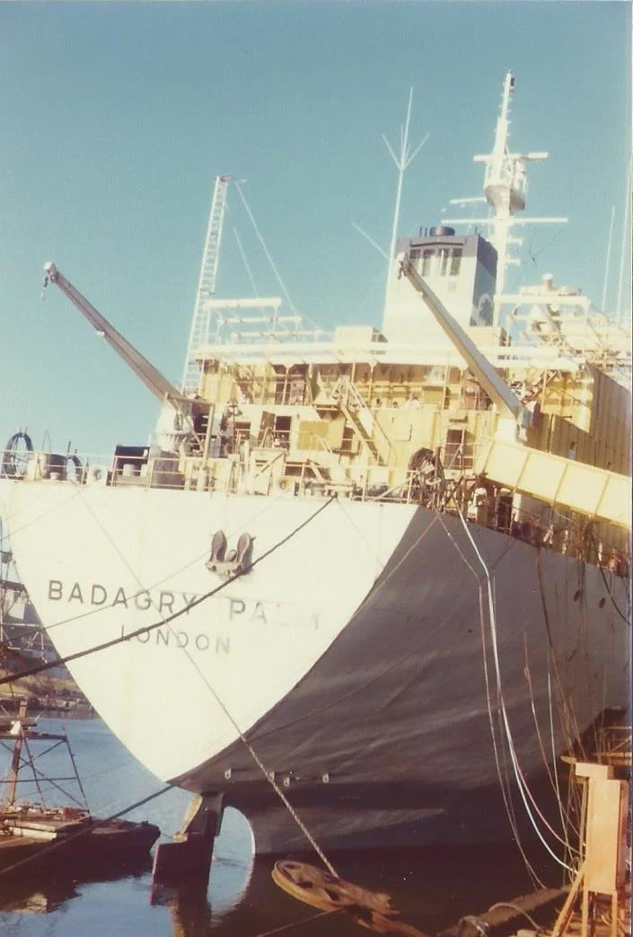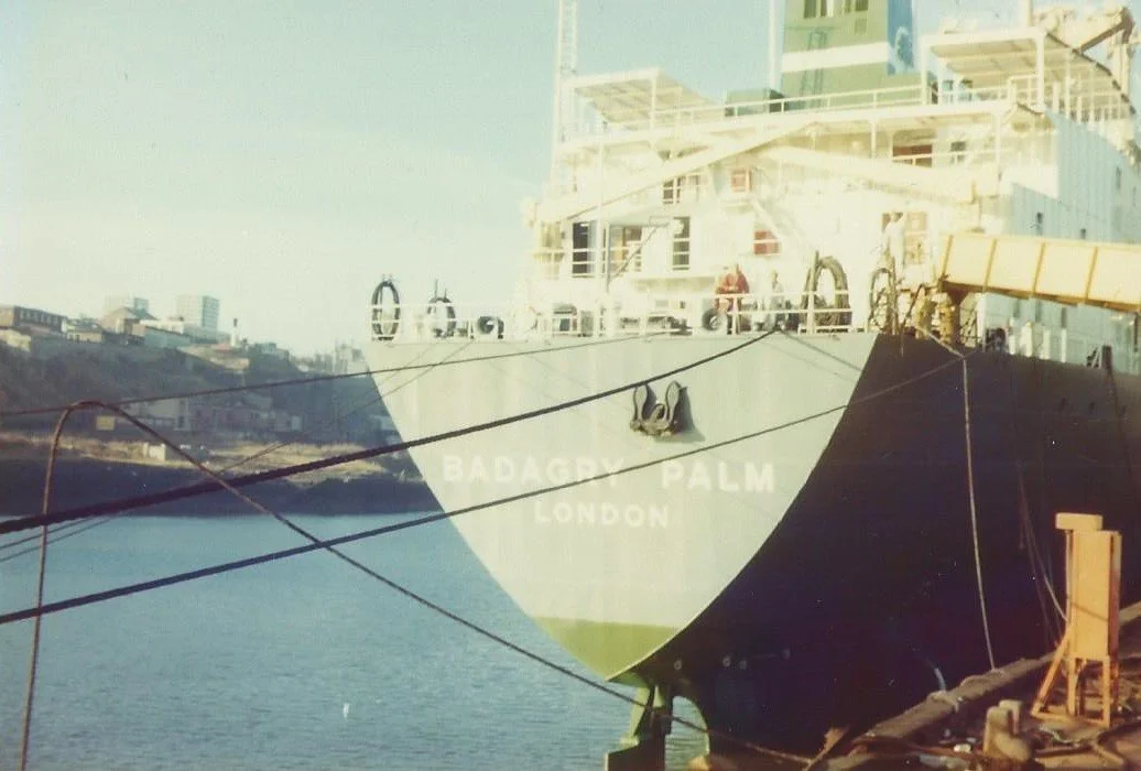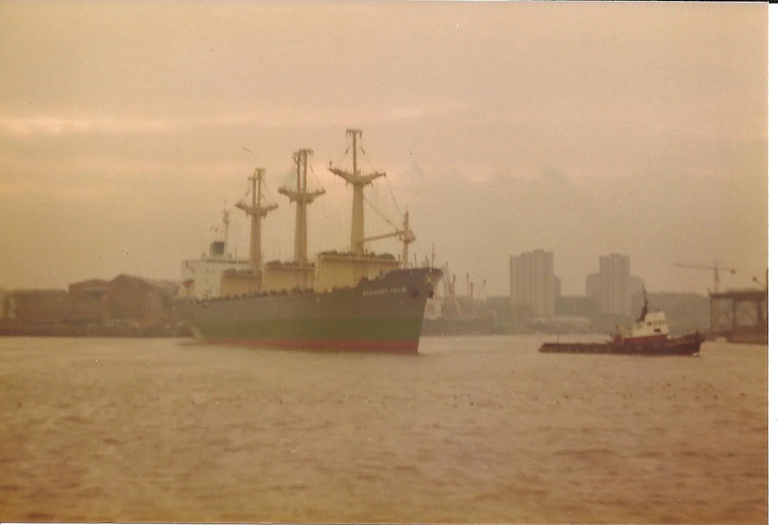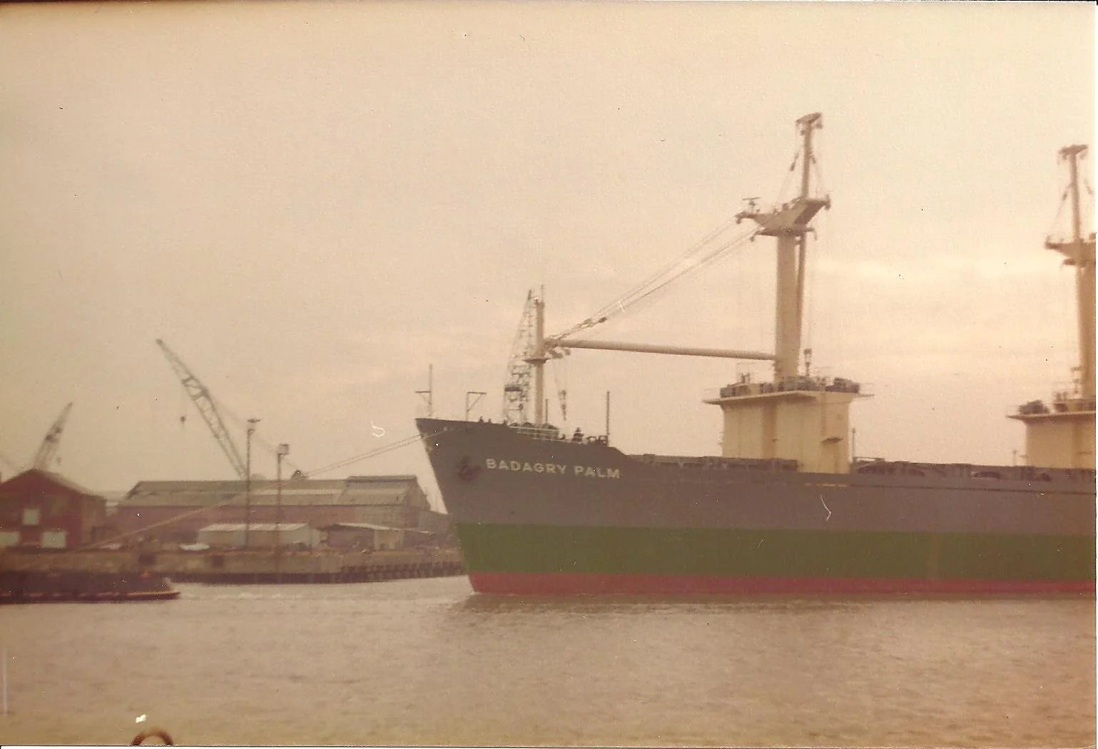 I’m not sure if these images are unique. They are the only ones I’ve ever seen of the Badagry Palm leaving the builders yard to go and load for her maiden voyage 12/11/79. Photos by Graham Hobbins