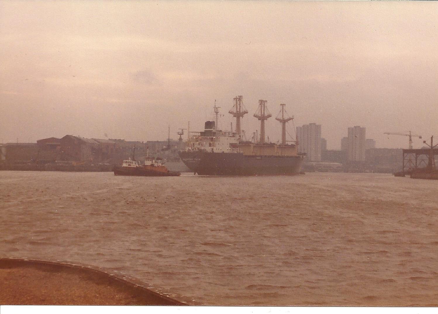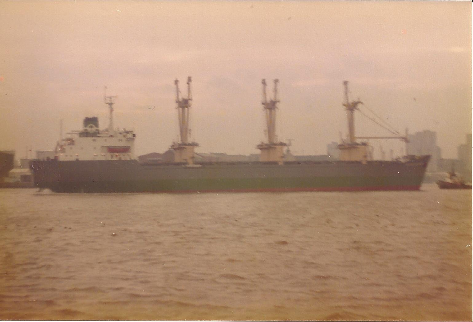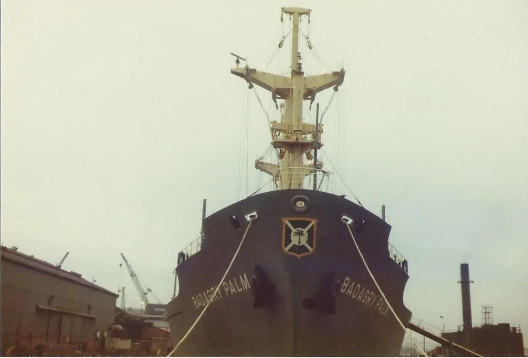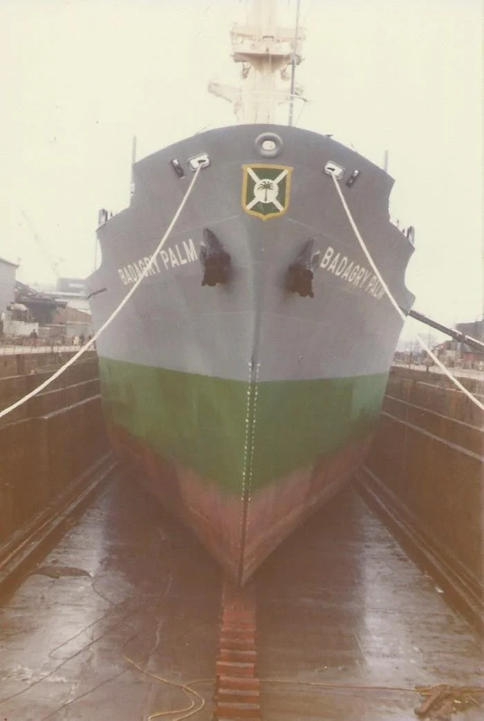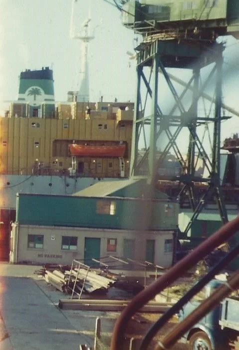 I’m not sure if these images are unique. They are the only ones I’ve ever seen of the Badagry Palm leaving the builders yard to go and load for her maiden voyage 12/11/79. Photos by Graham Hobbins