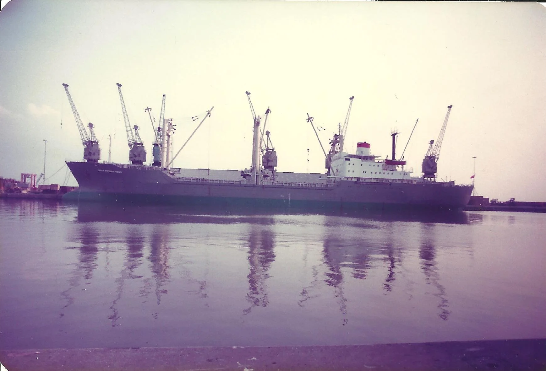 Santa Barbara Pacific, KGV dock Hull in 1983, one of her glamourous stops on her charter to the Columbus Line. © Graham Hobbins