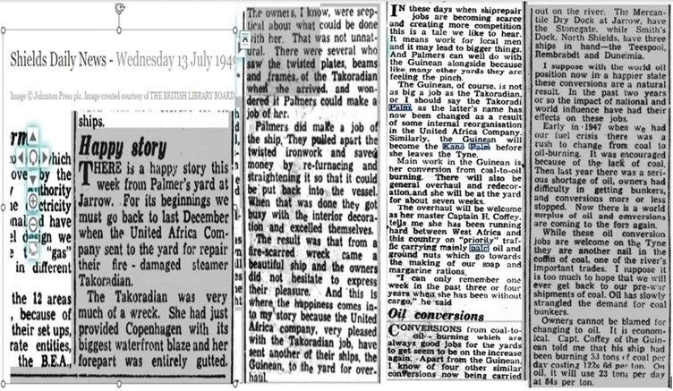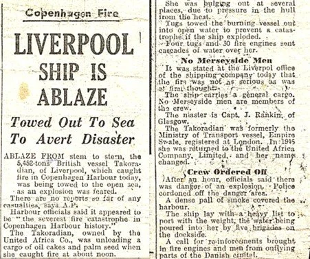 Non-war related accidents on the ships continued. On 6 October 1948, the Takoradian caught fire whilst in port in Copenhagen as described in the picture and newspaper articles below.