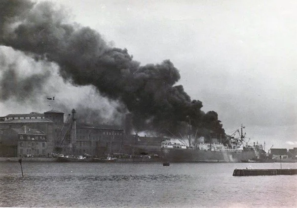 Takoradian on fire at her berth in Copenhagen – 6 October 1948