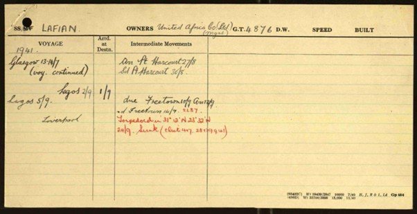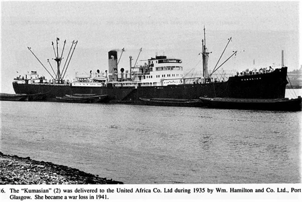 The first ship in the UAC fleet to be sunk was the Congonian in October 1940 when she was torpedoed by U-65 off Freetown. There was no loss of life. The next vessel to be sunk by torpedo from U-74 in the North Atlantic off the Irish Coast in August 1941 was the Kumasian, again with no loss of life. The following month, the Lafian (II) was lost, again sunk by submarine, this time U-107, 500 miles off the Azores.