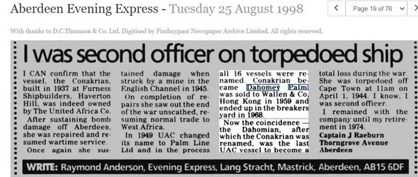 Captain Raeburn who later was to become a manager for the Palm Line Agencies in Lagos, was Second officer on the Conakrian during the war and he wrote the following letter in 1998. Following the bomb damage off Aberdeen earlier in the war, the vessel struck a mine in the English Channel in 1945 but again was successfully repaired.