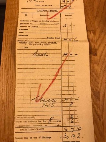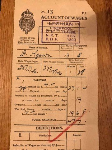 Seamen’s wages were also not overly generous as illustrated by the payslip of Sean Keown’s father shown below. Interestingly, although the war had been over for over a year, he was still paid a bonus of over 70% of normal wages as ‘war risk money’.