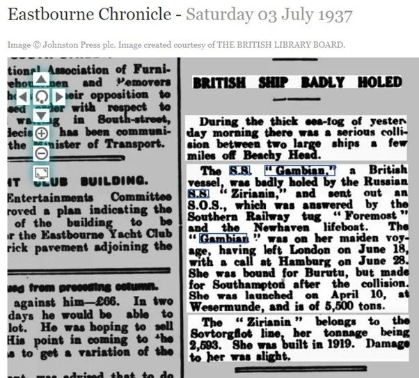 Another accident occurred when the Gambian (II) whilst on her maiden voyage on 2 July 1937, some 10 miles off Beachy Head, collided with a Russian vessel in dense fog.