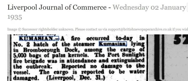 As might be expected, there were several unfortunate incidents on the ships over the twenty years of the company’s existence. Included in these was a fire on the Kumasian in Bromborough Dock in 1935.